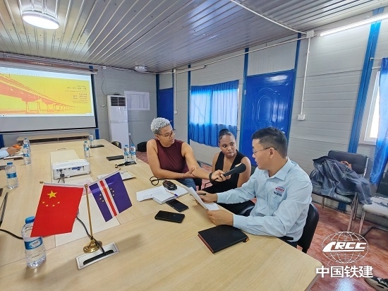 佛得角《島嶼快報》記者采訪項目經(jīng)理王圣輝(姚傳濤 攝)